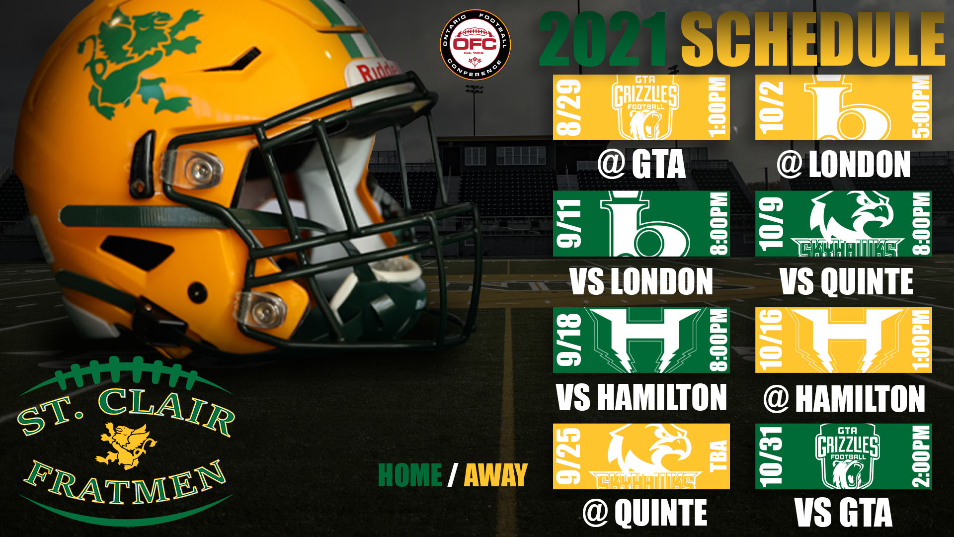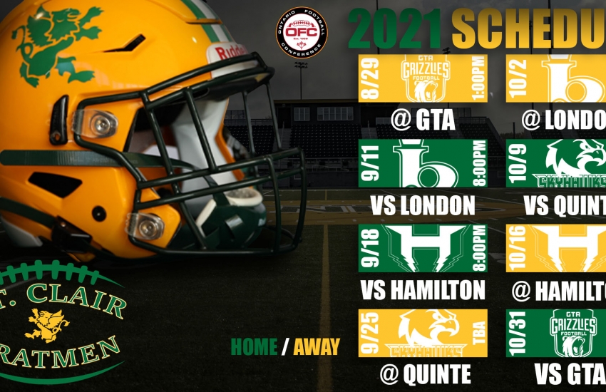 The St. Clair Fratmen are very pleased to announce their 2021 season schedule which will be an 8-game loop with five total teams vying for the Ontario Football Conference (OFC) Championship on Nov. 20th.