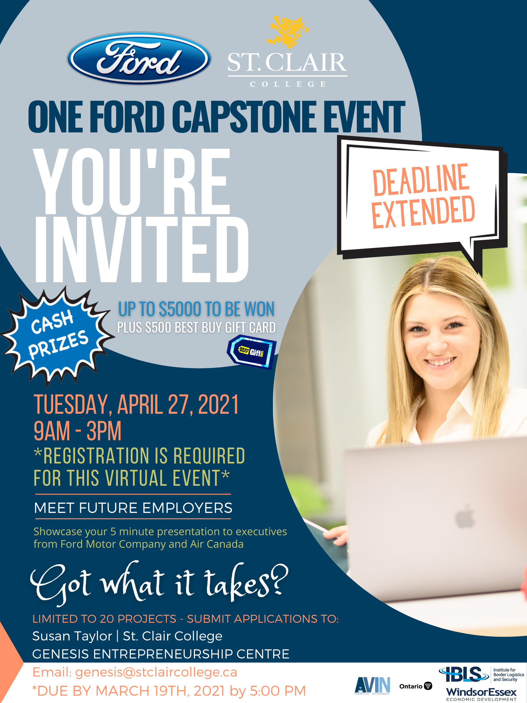Registration forms can be found at www.stclaircollege.ca/genesis by clicking on the Ford Capstone Poster to download or by emailing genesis@stclaircollege.ca.
