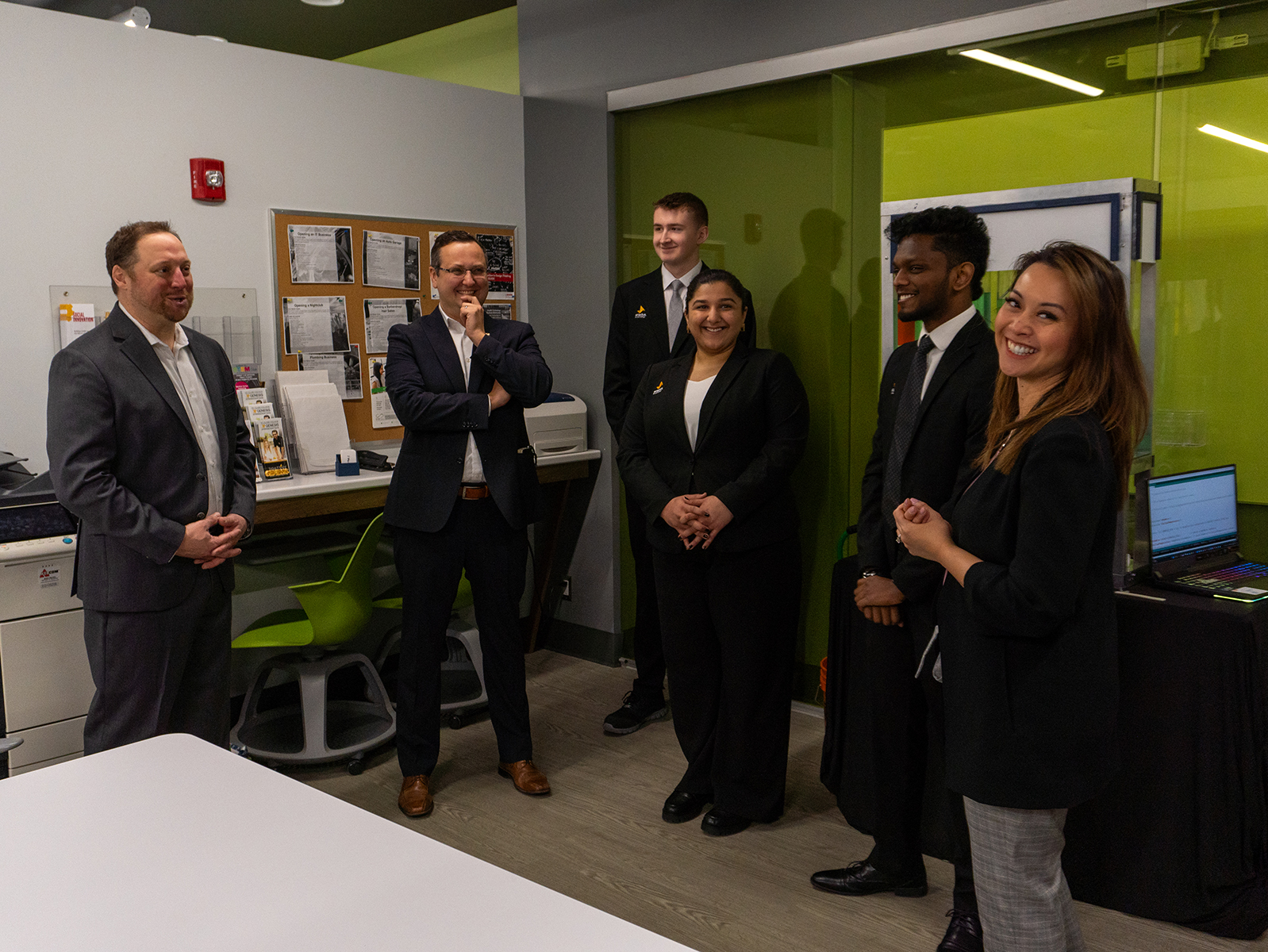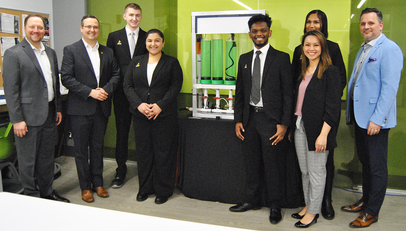 Minister Valdez and MP Kusmierczyk spoke with students at the Genesis Centre for Experiential Learning and Career Services, including members of Enactus St. Clair Project Dyssolve who brought along their photobioreactor prototype. Project Dyssolve placed first at Enactus’s Central Canada Innovation Challenge and Environmental Sustainability Challenge last Friday. The team will be competing in the national championship in May.