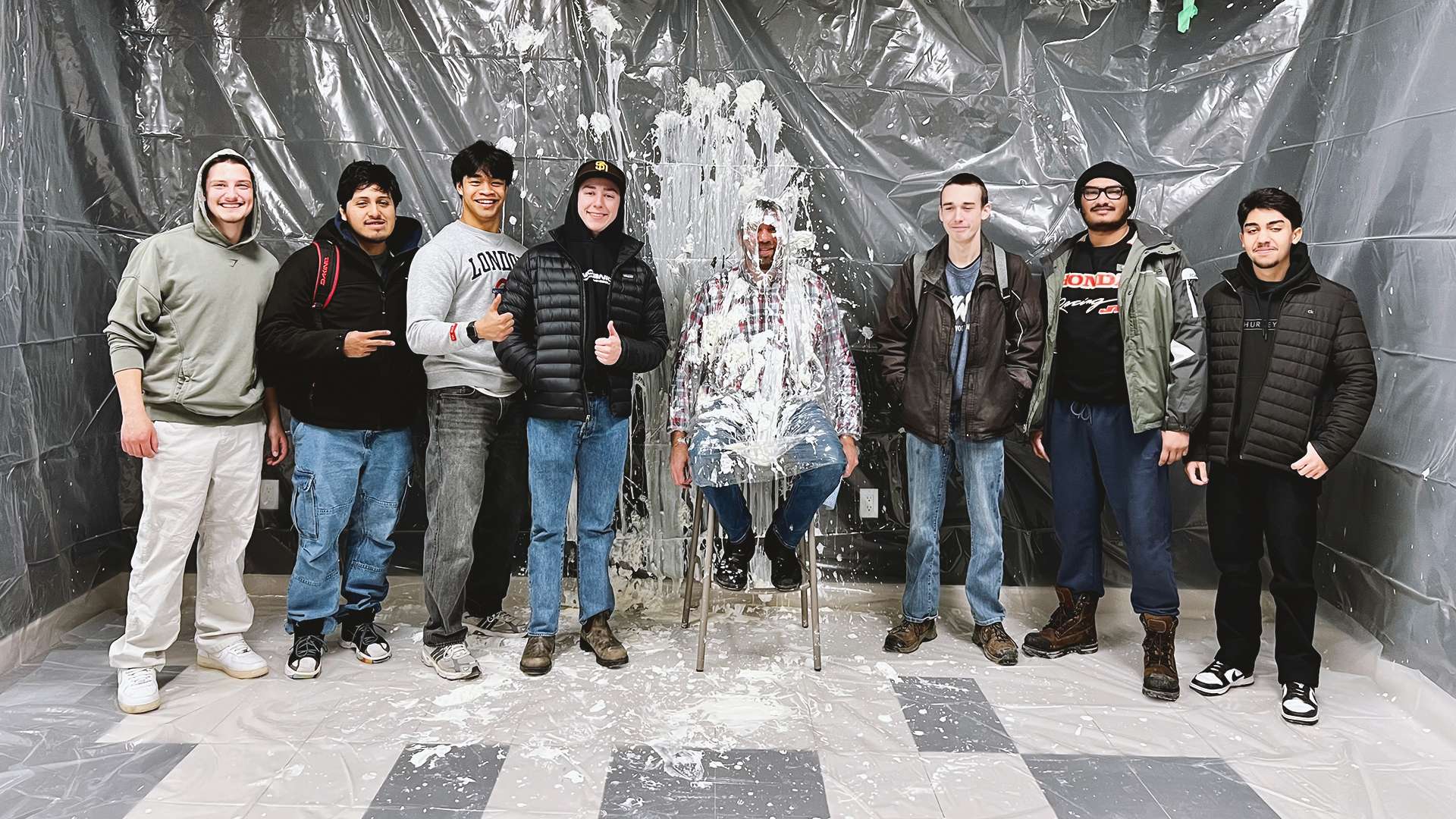 Professors Ryan Pepper, Peg Smolders, Derek Jane, Andrea Pepper, Adrian Viselli, Greg Bartlett, Mark Petryshyn along with Thames Students Inc. president, Suhas Rawal, TSI members Kaitlynn Byrne and Rogier Blondeel all volunteered to get a little messy for the cause.