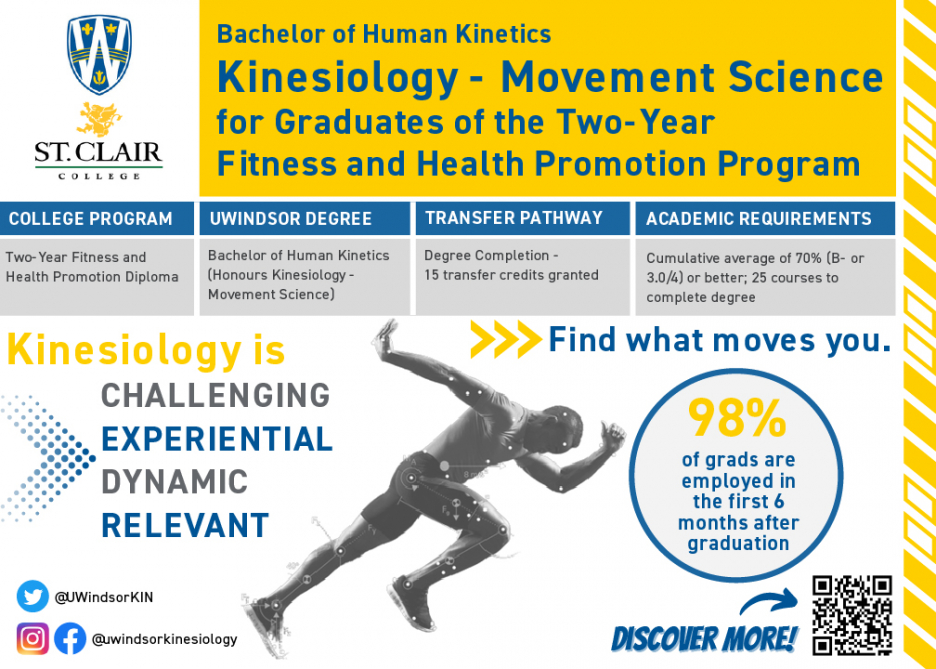 St. Clair College graduates from the Fitness & Health Promotion Program (H879) are eligible to apply to the following Universities to complete a Bachelor of Science Degree or the University of Windsor for a Bachelor of Science - Kinesiology and Health Studies degree.